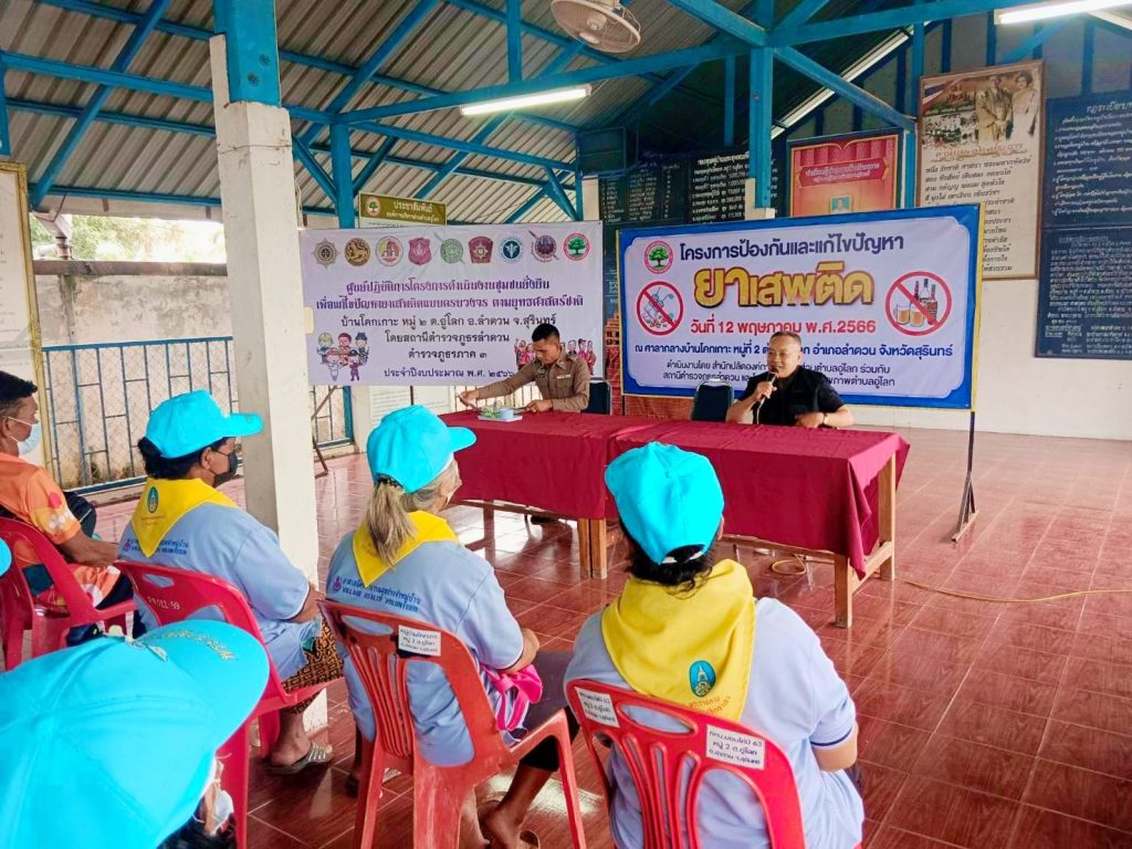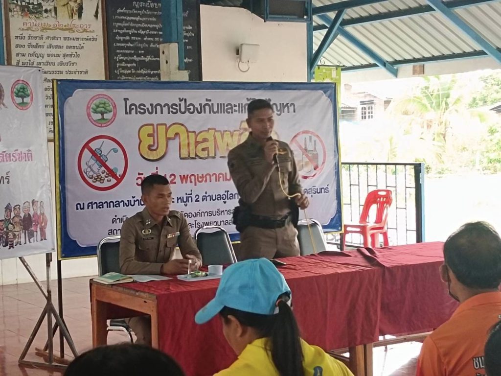 มอบหมายให้ พ.ต.ท.เตือน สอดส่อง รอง ผกก.สส.สภ.ลำดวน ,พ.ต.ต.บุญลือ ม่วงศรี สวป.ฯ/หน.ชช.ยย.ฯ พร้อมชุด ชช.ยย. สภ.ลำดวน,นายวิเชียร เอี่ยมสะอาด ผอ.รพ.สต.อู่โลก, ผู้นำชุมชน ,ประชาชนบ้านโคกชเกาะ และผู้เข้าร่วมโครงการฯ(ผู้บำบัด) ร่วมกับ อบต. อู่โลก จัดกิจกรรมโครงการอบรมการป้องกันและการแก้ปัญหายาเสพติด โดยมี นายธงชัย บวรวัฒนานุกิจ นายก อบต.อู่โลก เป็นประธานในพิธี และมอบอุปกรณ์การตรวจหาสารเสพติด(ยาบ้า) ให้กับ สภ.ลำดวน เพื่อนำไปใช้ในโครงการชุมชนยั่งยืนต่อไป ณ ศาลากลางหมู่บ้านโคกเกาะ ม.2 ต.อู่โลก อ.ลำดวน จ.สุรินทร์